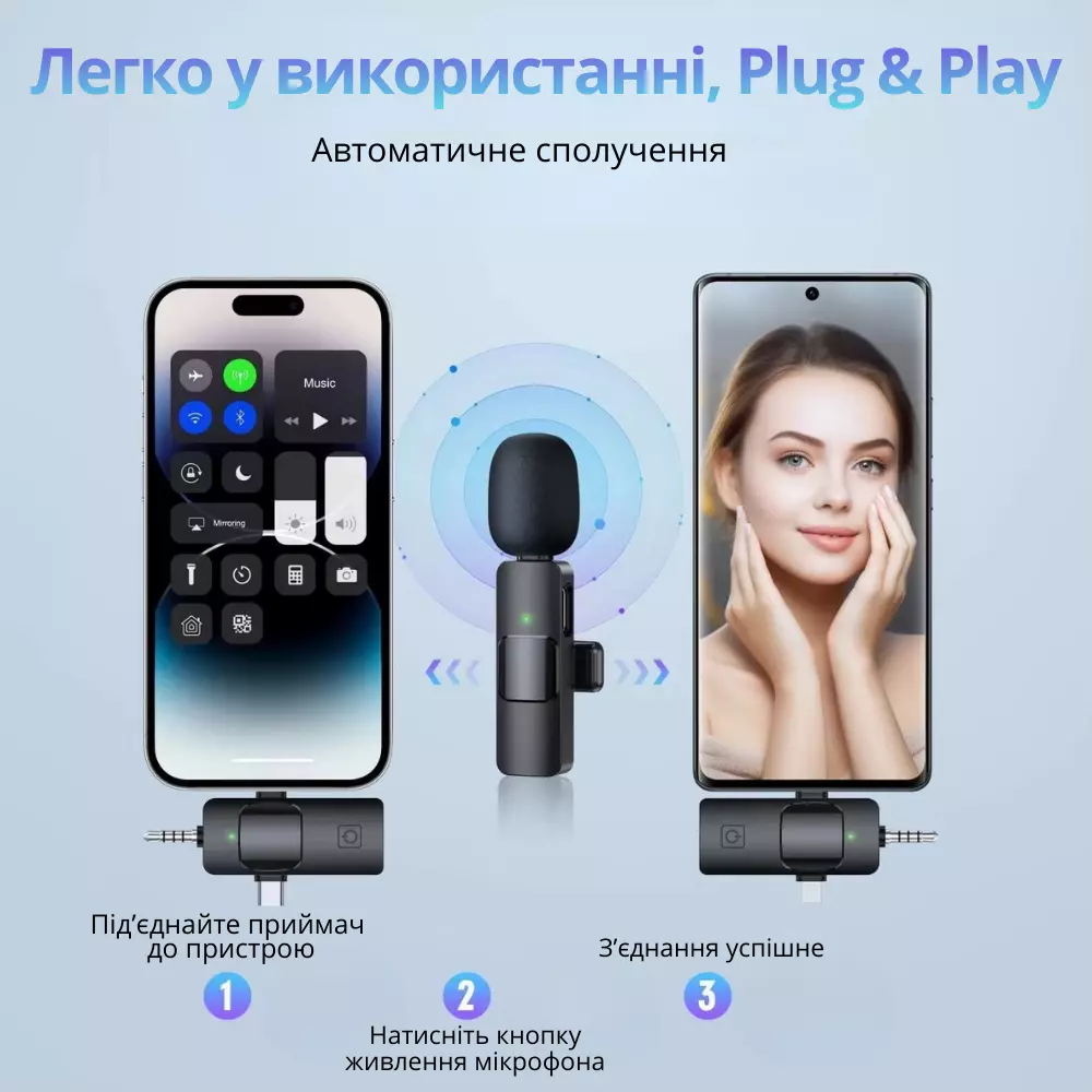 Універсальний приймач 3-в-1 забезпечує сумісність з більшістю пристроїв: Type-C, Lightning та 3.5 мм (TRS) — для смартфонів iPhone, Android, камер, комп’ютерів та інших аудіопристроїв. Підключення здійснюється за принципом Plug & Play — без Bluetooth, застосунків і складних налаштувань.