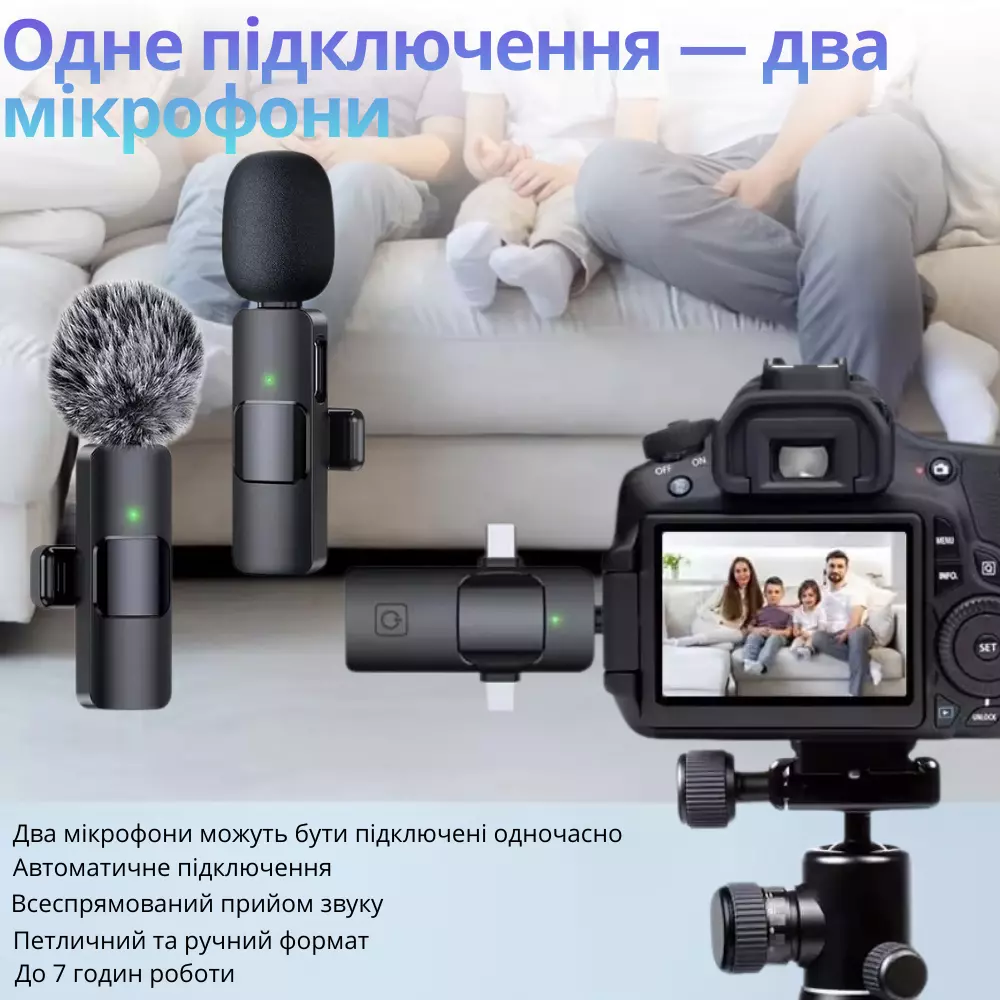 Мікрофони працюють за стабільною бездротовою технологією з дальністю передачі до 20 метрів, без затримок і перешкод. Підтримується одночасне підключення двох мікрофонів до одного приймача, що ідеально підходить для інтерв’ю або запису з двома спікерами.