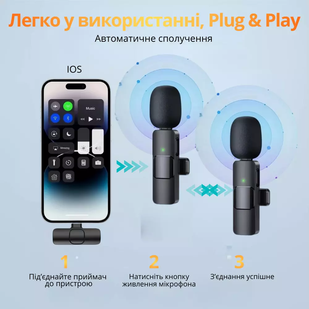 Микрофоны беспроводные петличные с шумоподавлением ONELEADER K9,подключение разъём Lighting для IPhone