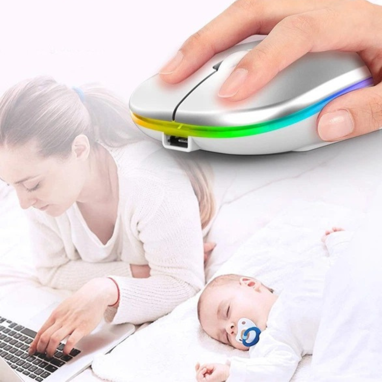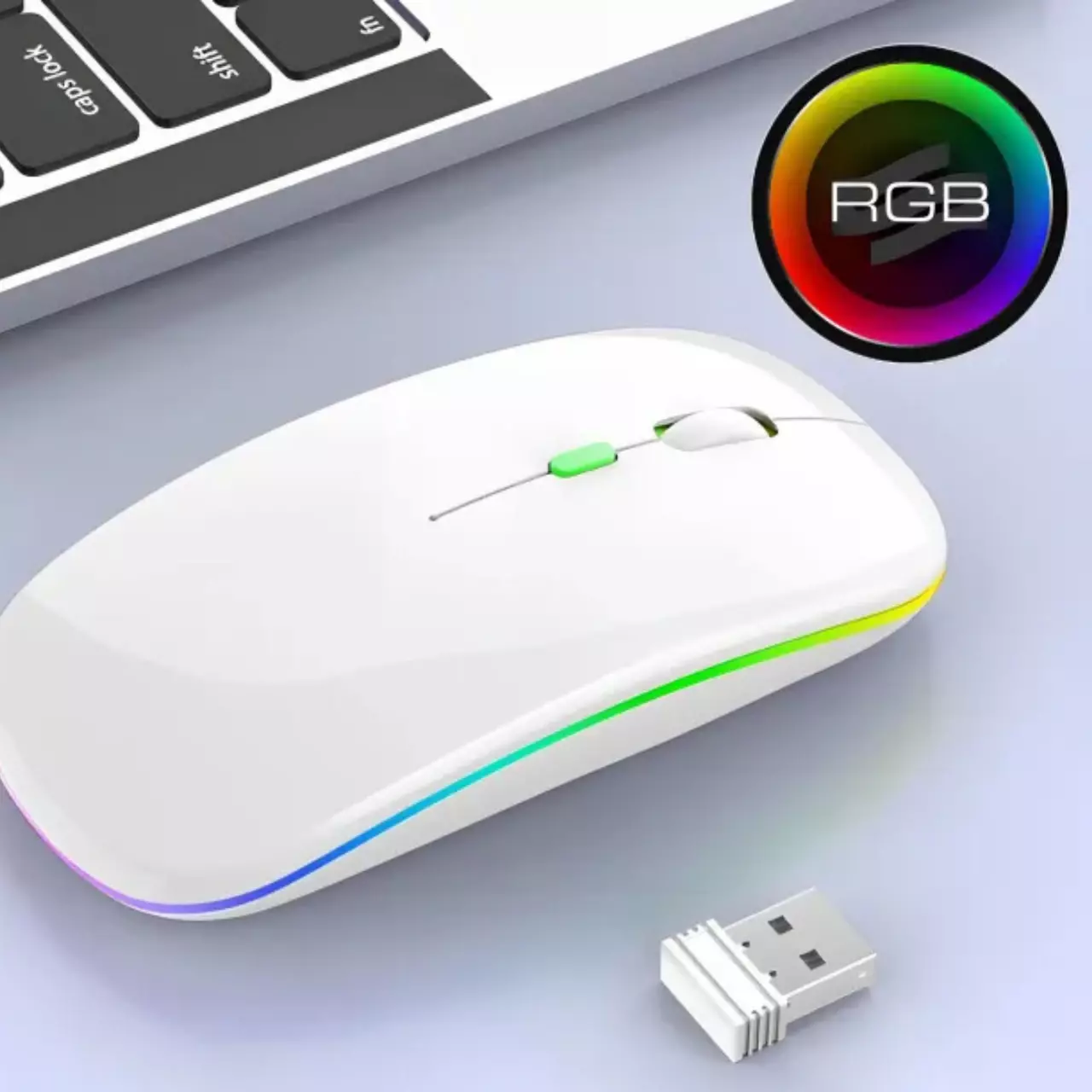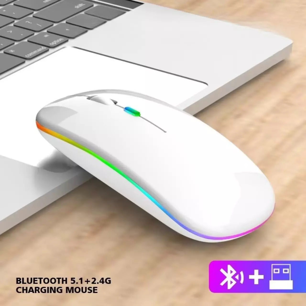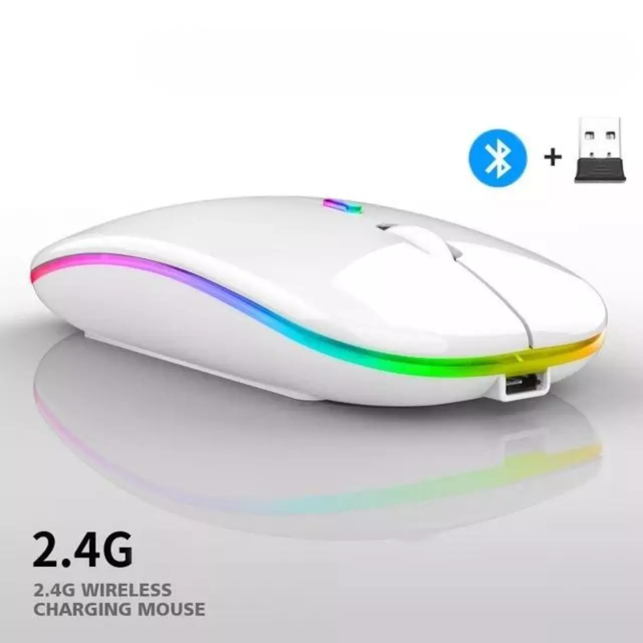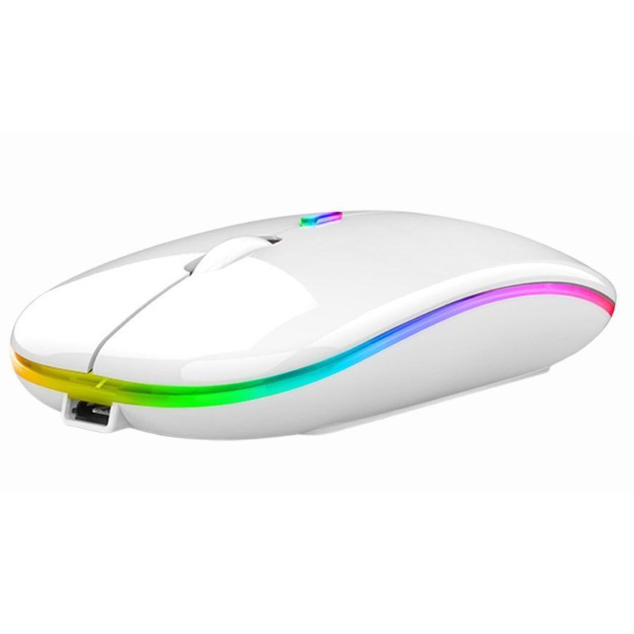 Мишка бездротова комп'ютерна, безшумна, оптична з RGB-підсвічуванням 2.4G+Bluetooth DPI 800/1000/1200 біла