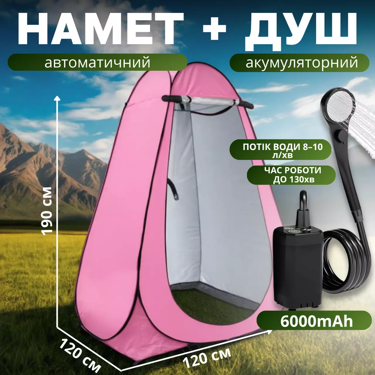 Набір 2в1 туристичний намет + душ: акумуляторний портативний кемпінговий душовий мобільний комплект для туризму, рожевий