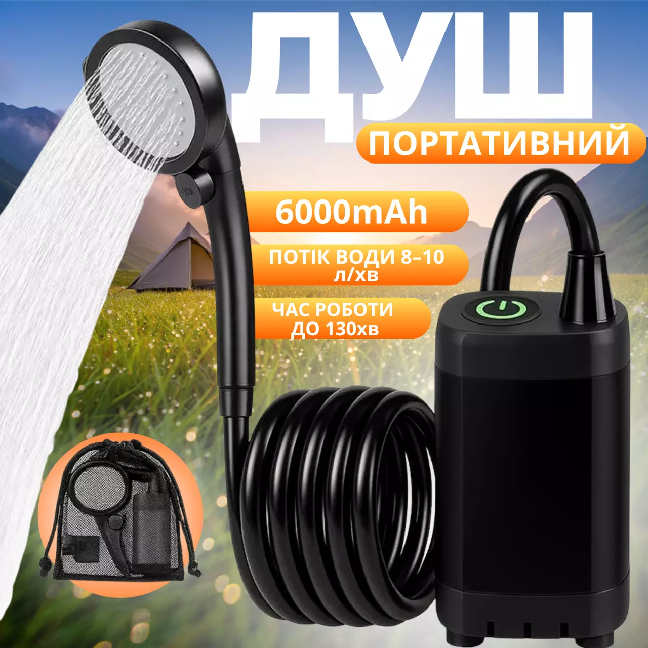 Портативний душ оснащений потужним акумулятором на 6000 мАг, що забезпечує стабільний напір води до 8–10 л/хв. Довгий шланг робить використання максимально комфортним, а корпус з ABS і PVC гарантує надійність і довговічність. Відмінно підходить для душу, миття рук, посуду, овочів або домашніх тварин у похідних умовах.