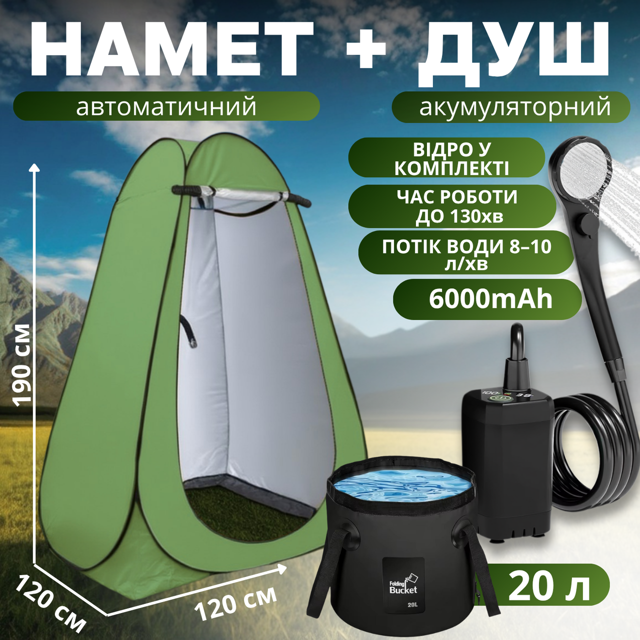 Набір 3в1 туристичний намет + акумуляторний душ + відро 20 л кемпінговий душовий мобільний комплект для туризму, зелений