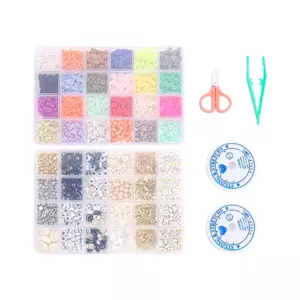 Набір включає зручний бокс-органайзер із комірками, який допомагає акуратно зберігати та сортувати всі елементи. У комплекті представлений бісер 48 видів: кольорові, перламутрові намистини, намистини з літерами англійського алфавіту і металеві елементи для стильних акцентів. Також до комплекту входять безпечні ножиці та бобіна з прозорою силіконовою еластичною силіконовою ниткою-гумкою 0,7 мм, яка чудово підходить для біжутерії.