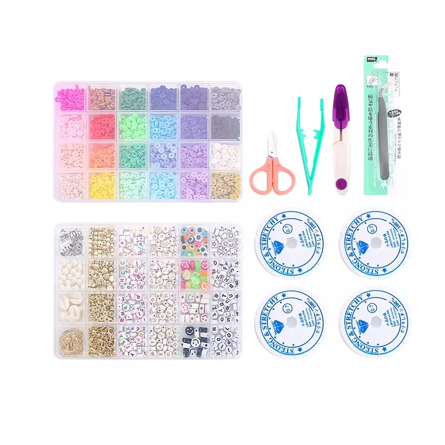 Набір включає зручний бокс-органайзер із комірками, який допомагає акуратно зберігати та сортувати всі елементи. У комплекті представлений бісер 48 видів: кольорові, перламутрові намистини, намистини з літерами англійського алфавіту і металеві елементи для стильних акцентів. Також до комплекту входять безпечні ножиці та бобіна з прозорою силіконовою еластичною силіконовою ниткою-гумкою 0,7 мм, яка чудово підходить для біжутерії.