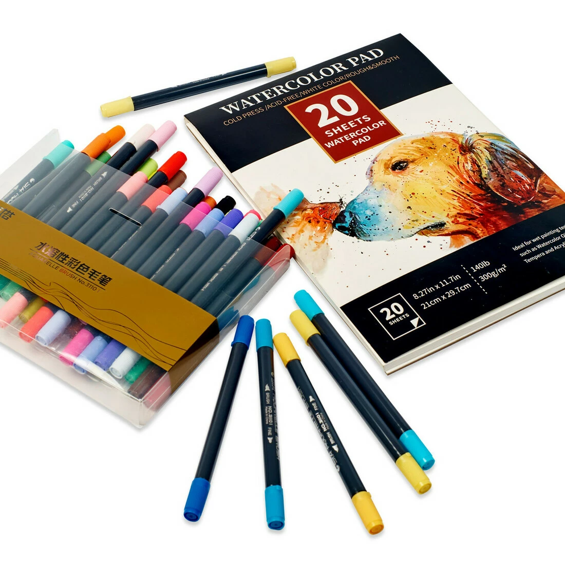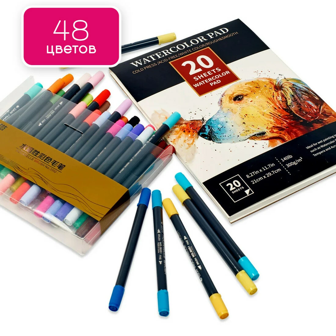 Набір для скетчів, двосторонні акварельні маркери для малювання 48 шт + акварельний папір для скетчинга 20 аркушів