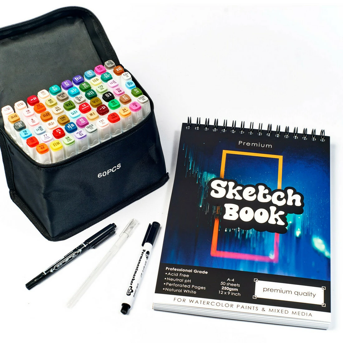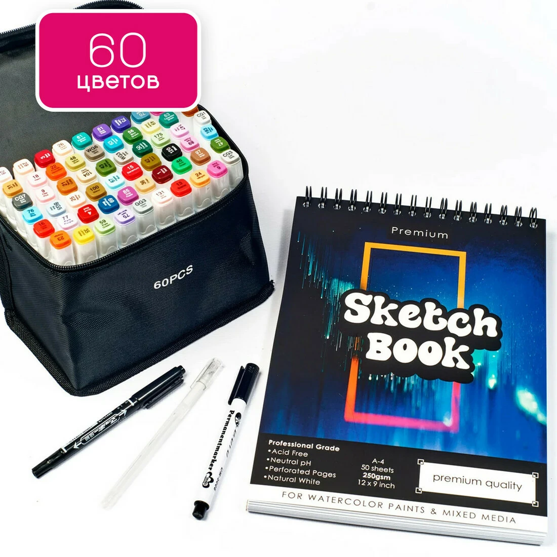 Набір для скетчів, маркери спиртові двосторонні для ескізів Touch Smooth 60 кольорів + скетчбук А4
