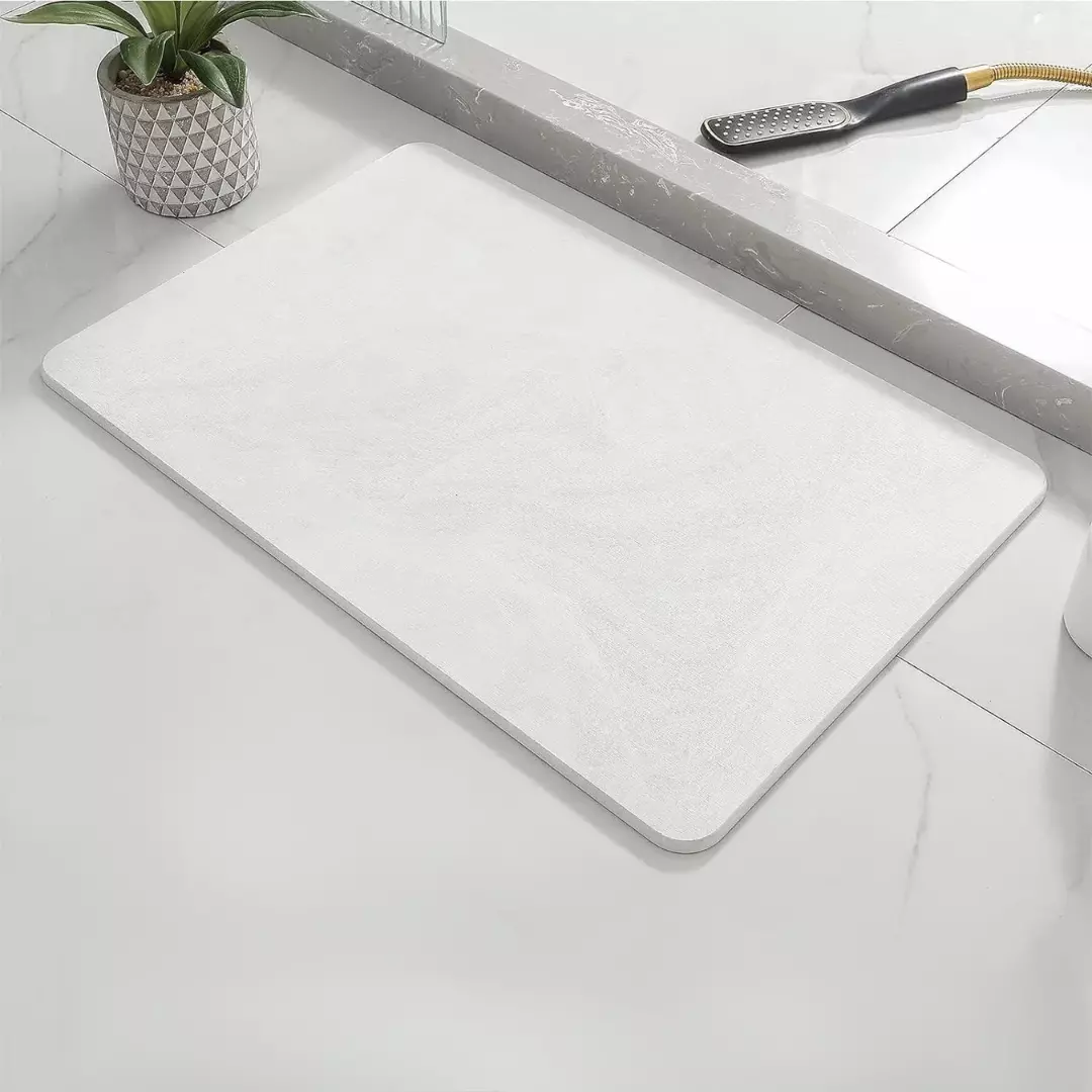 Комплект виготовлено з діатоміту - природного екологічно чистого матеріалу, який складається зі скам'янілих водоростей. Діатоміт вирізняється високою вологопоглинаючою здатністю, миттєво вбирає воду і швидко висихає, запобігаючи розмноженню бактерій і появі цвілі. Завдяки цим властивостям килимки і підставка забезпечують комфортне використання і довгий термін служби.