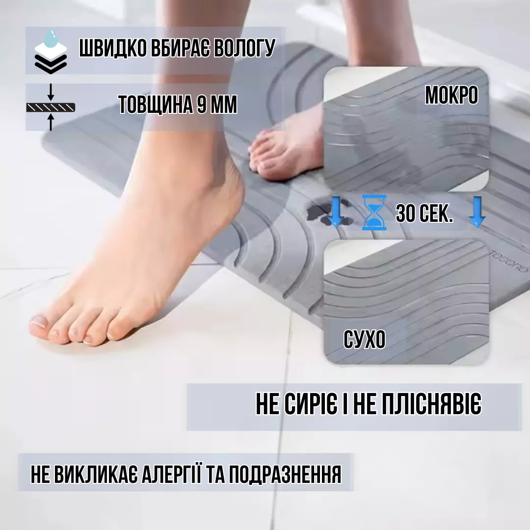 • Килимок для ніг (60×39 см, товщина 9 мм) – м’який, приємний на дотик і швидко вбирає вологу, залишаючи поверхню сухою.