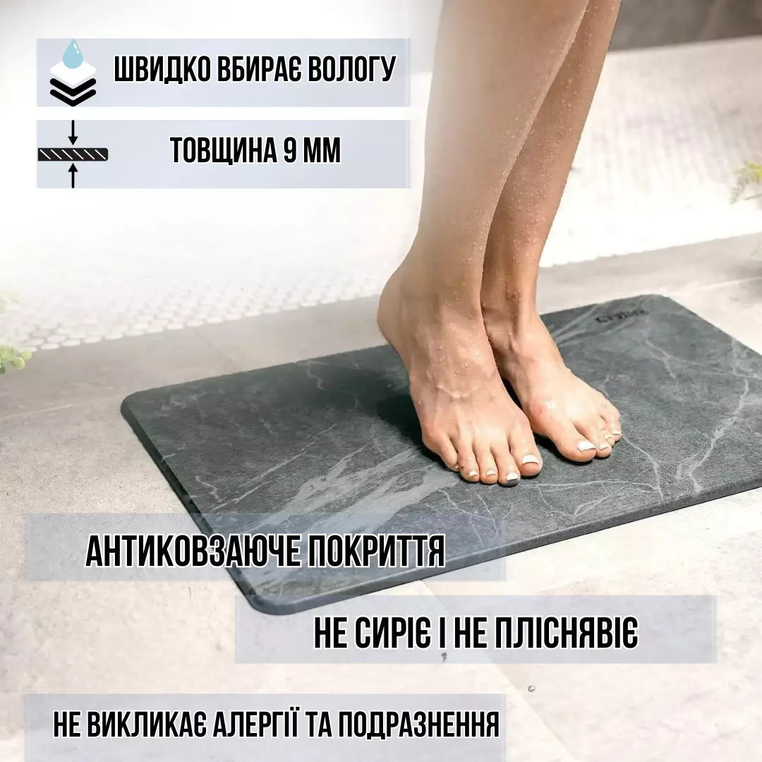 Комплект виготовлений із діатоміту — природного мінералу, що складається з найдрібніших скам’янілих водоростей. Цей матеріал відомий своєю високою вологопоглинальною здатністю: він миттєво вбирає воду та швидко висихає, запобігаючи появі плісняви та неприємних запахів. Діатоміт безпечний для здоров’я, довговічний і простий у догляді, що робить його чудовим вибором для ванної кімнати.