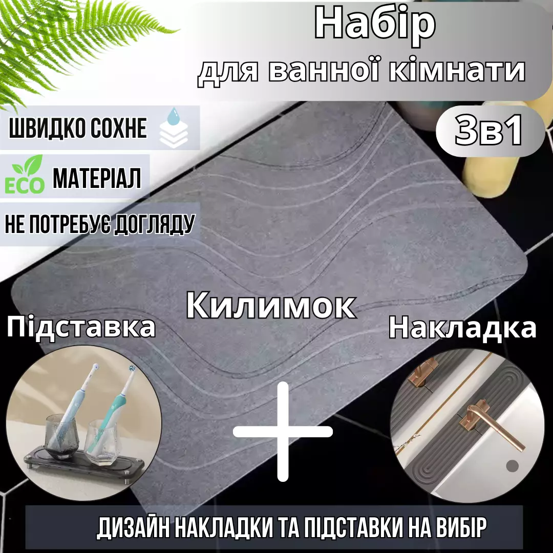 Цей комплект не тільки виконує практичні функції, а й додає ванній кімнаті стильного вигляду. Килимок для ніг забезпечує безпеку, не ковзає та миттєво висихає. Накладка на раковину зменшує контакт поверхні з водою, допомагаючи підтримувати її чистоту. Універсальна підставка дозволяє оптимізувати простір та зручно розмістити необхідні аксесуари. Комплект не потребує складного догляду, стійкий до вологи та зберігає свій привабливий вигляд упродовж тривалого часу.