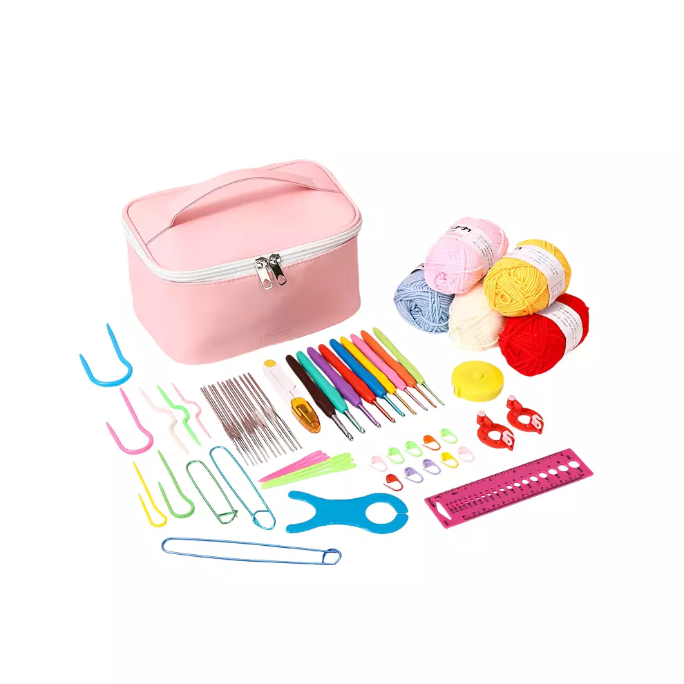 Набір для в'язання гачком із пряжею та аксесуарами в косметичці, рожевий колір