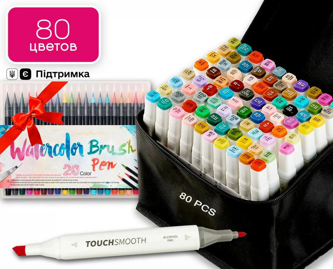 Ви купуєте Набір двосторонніх маркерів Touch Smooth для скетчинга на спиртовій основі 80 шт і разом з ними отримуєте Набір акварельних маркерів Water Color Brush маркер - пензлик 20 кольорів