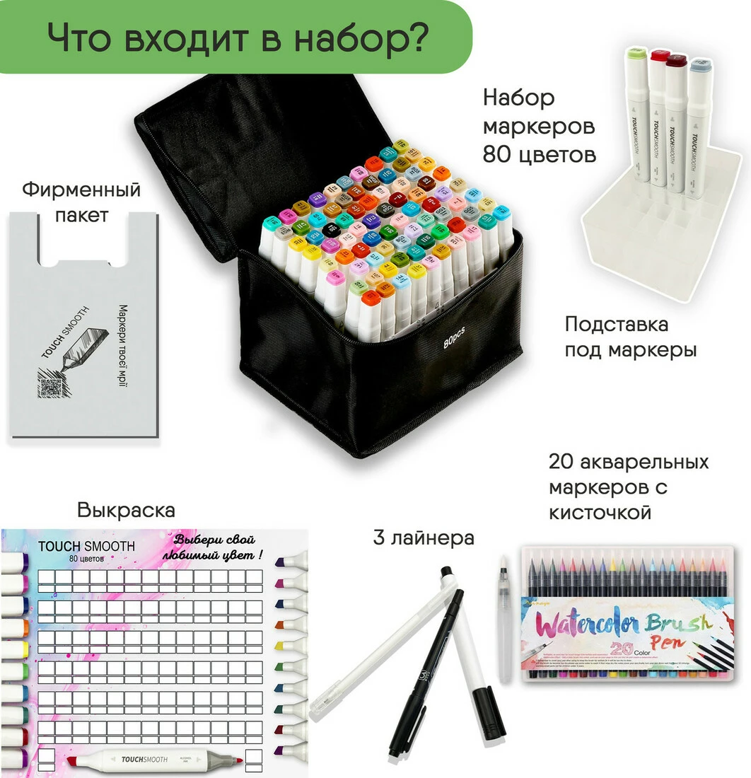 Набір двосторонніх маркерів Touch Smooth на спиртовій основі 80 шт + 20 шт маркерів для скетчинга з пензликом