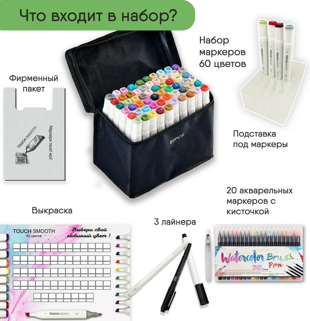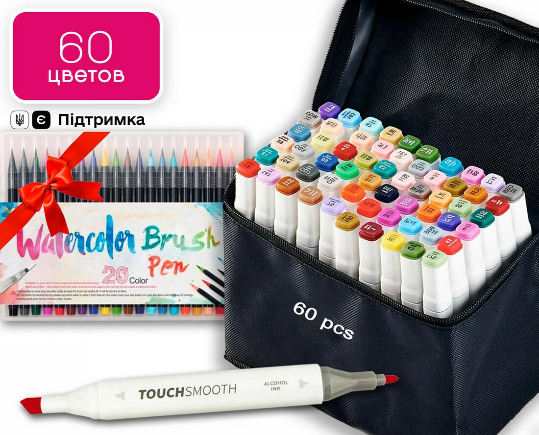 Ви купуєте Набір двосторонніх маркерів Touch Smooth для скетчинга на спиртовій основі 60 шт і разом з ними отримуєте Набір акварельних маркерів Water Color Brush маркер - пензлик 20 кольорів