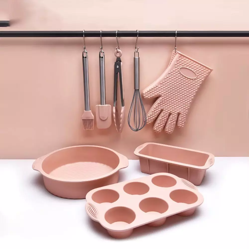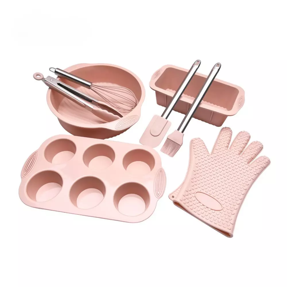 Набір форми силіконові для випічки 8 штук, комплект кухонного приладдя з прихваткою, Колір Рожевий