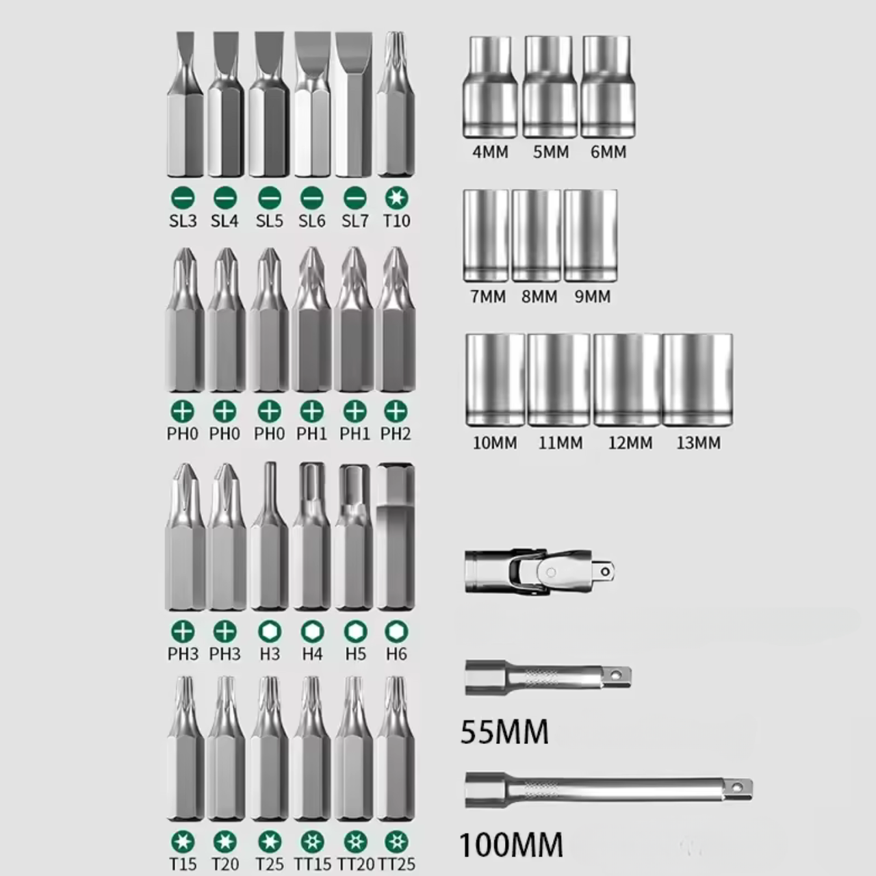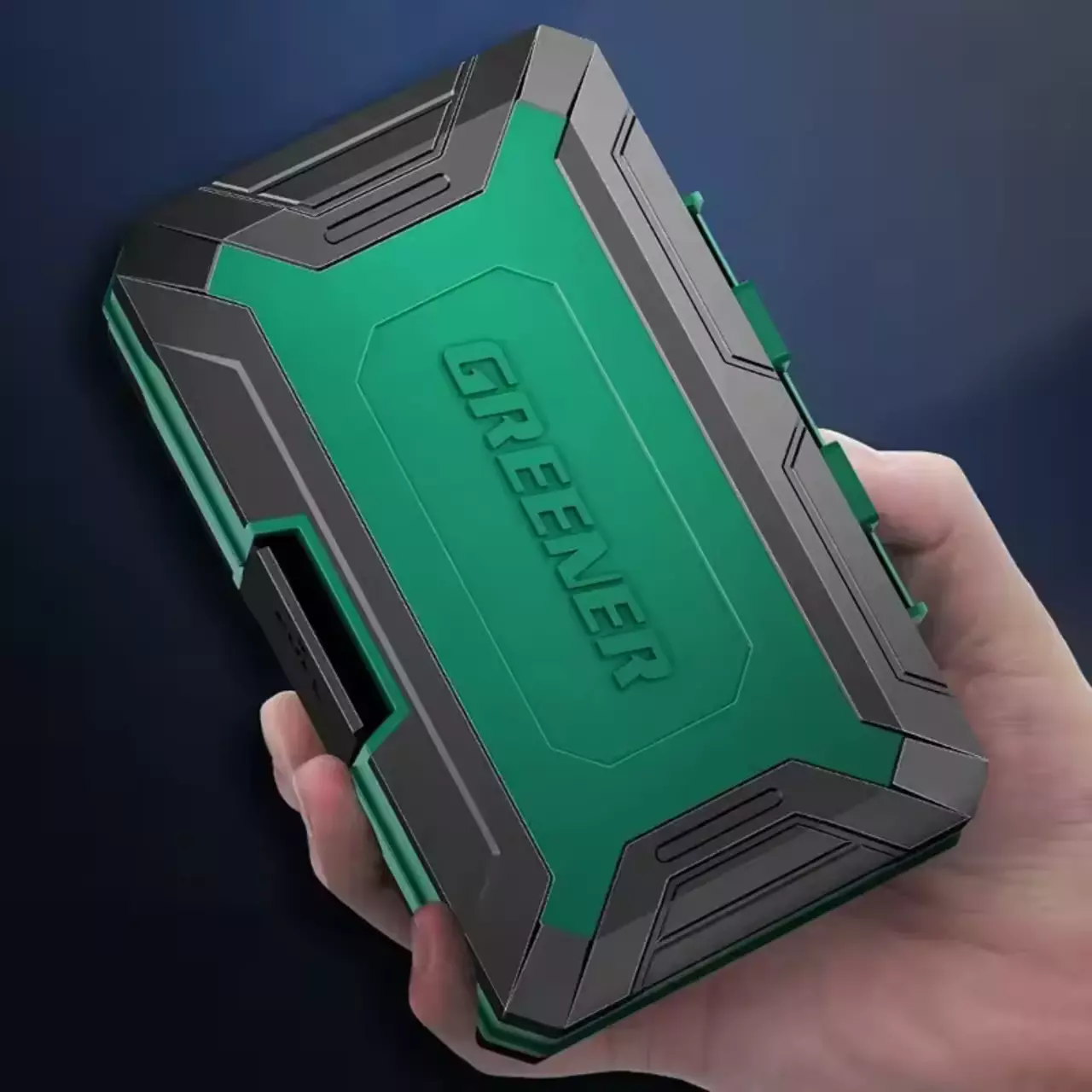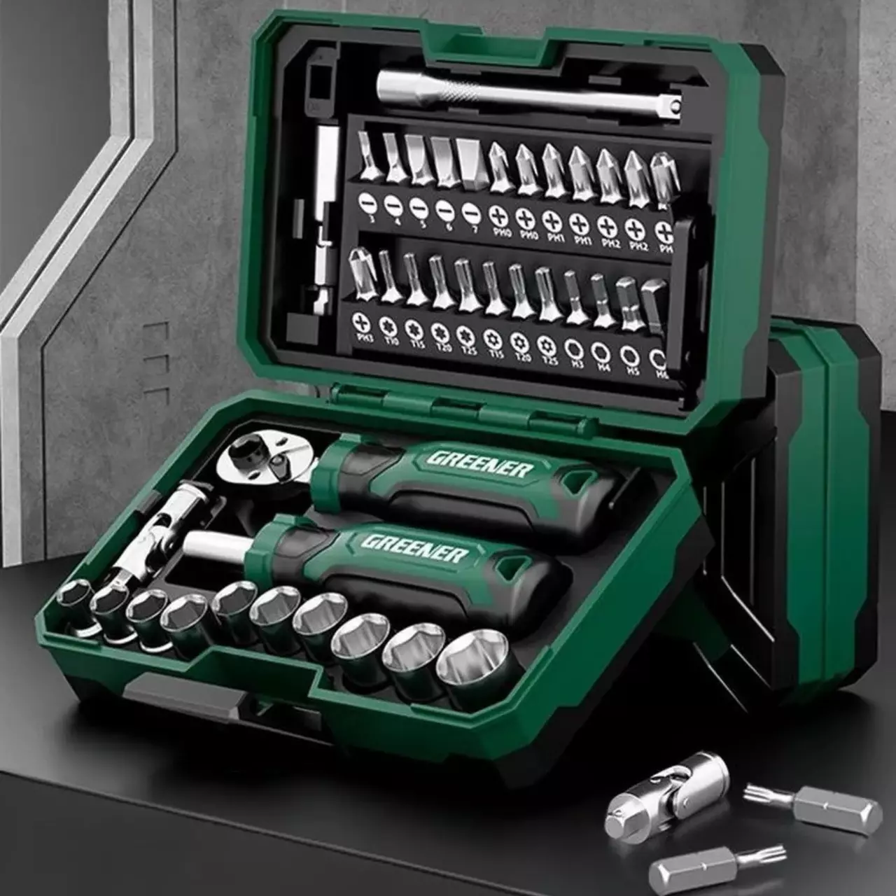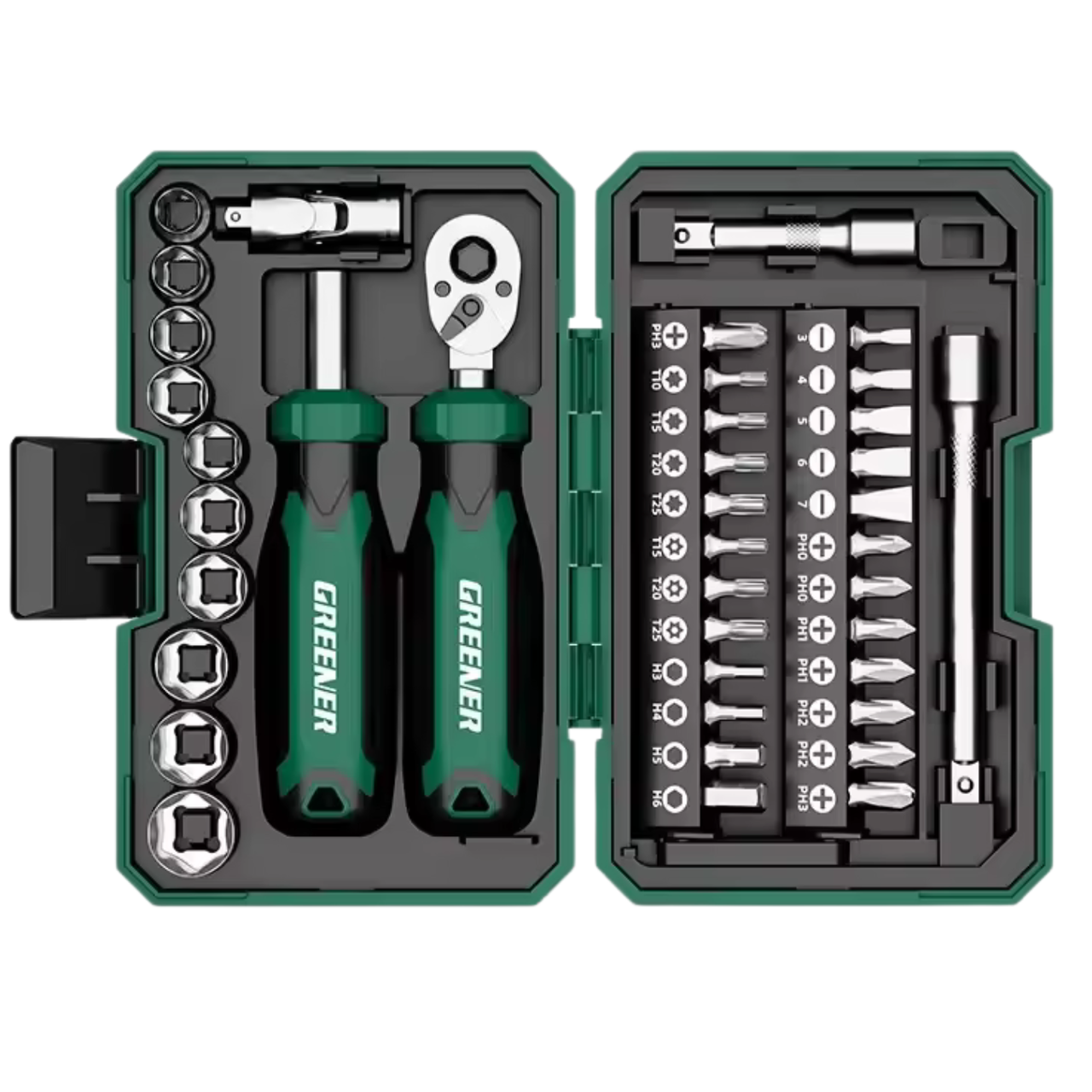 Всі елементи акуратно розміщені в міцному пластиковому кейсі з надійною засувкою. Набір легко транспортувати і зручно зберігати — інструменти завжди під рукою і не губляться.