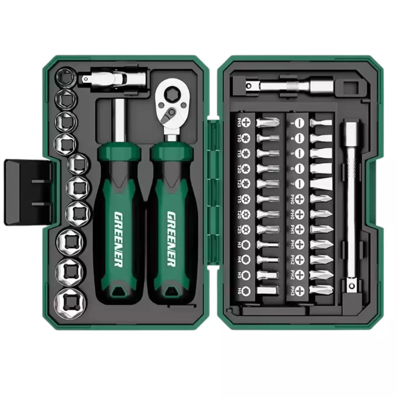 Набір інструментів для ремонту 40 шт: викрутка з перехідниками, тріскачка, набір біт, набір торцевих головок, в протиударному