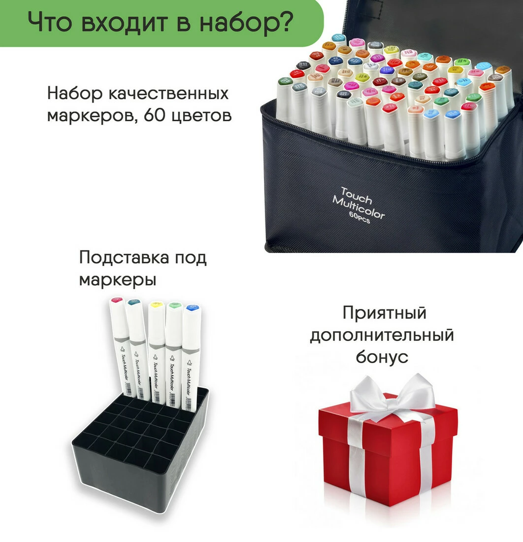 - Дополнительные характеристики: Маркеры. Набор двусторонних маркеров Touch для рисования и скетчинга на спиртовой основе 60 штук