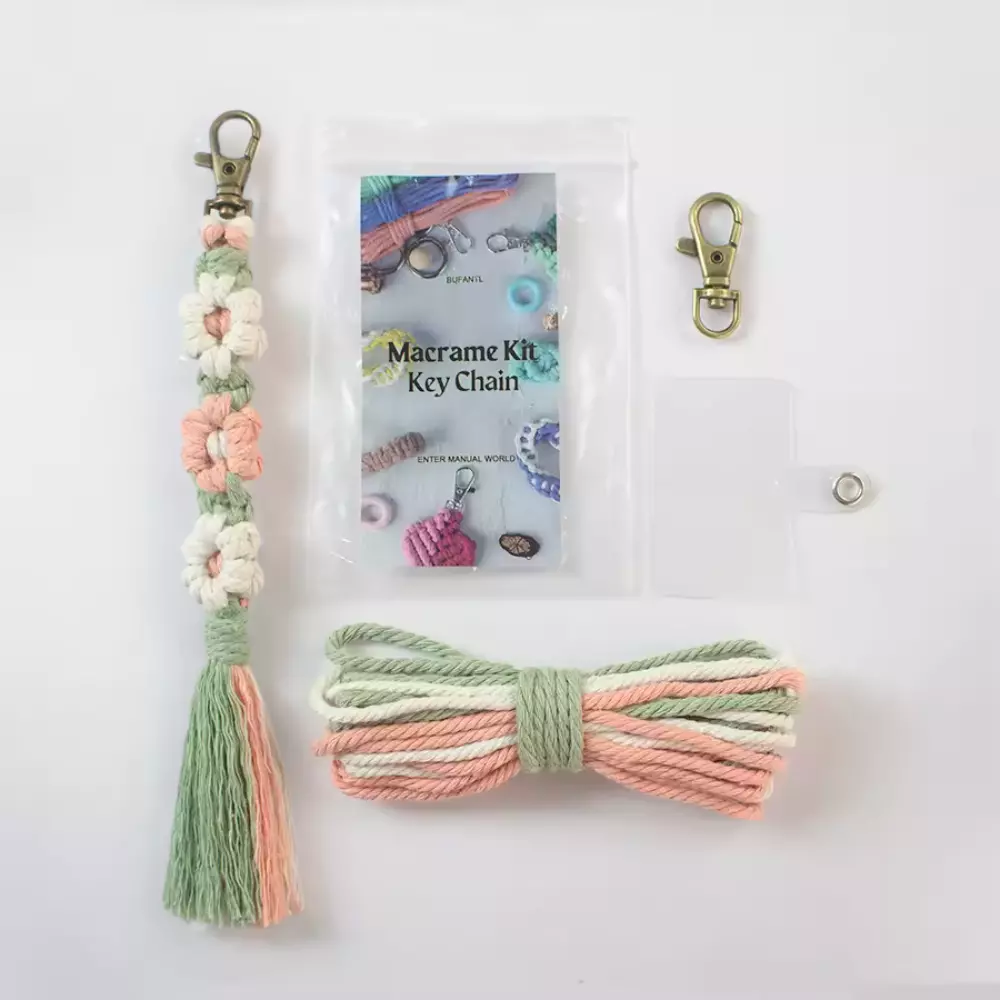 Набір макраме для рукоділля: плетений брелок-стрічка (20 × 2.2 см) — набір для створення стильного аксесуару власноруч. Готовий виріб — це плетений брелок у вигляді декоративної стрічки, виконаної з бавовняних шнурів трьох кольорів: зеленого, рожевого та білого. Брелок має металевий карабін, що зручно для кріплення до ключів, сумки чи рюкзака. У комплект входить покрокова інструкція зі створення виробу — чудово підходить для початківців.