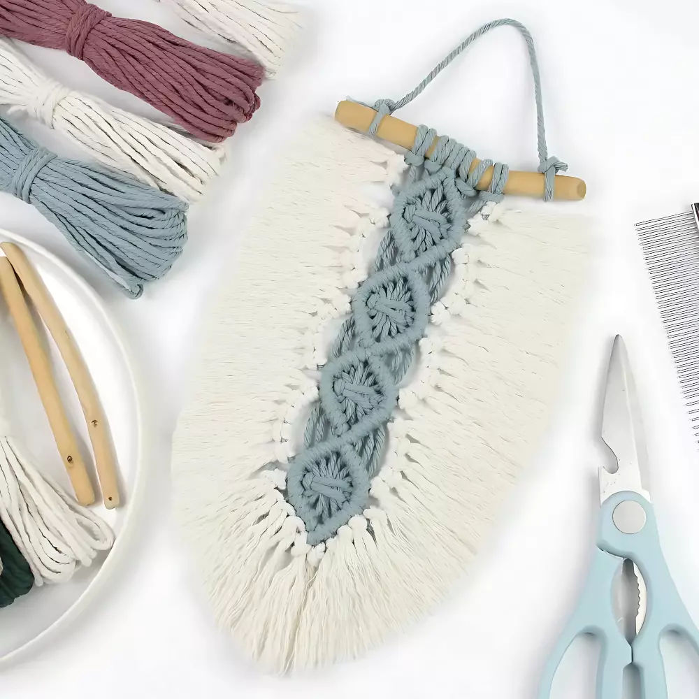 усе необхідне для плетіння листка у техніці макраме. Голубий і