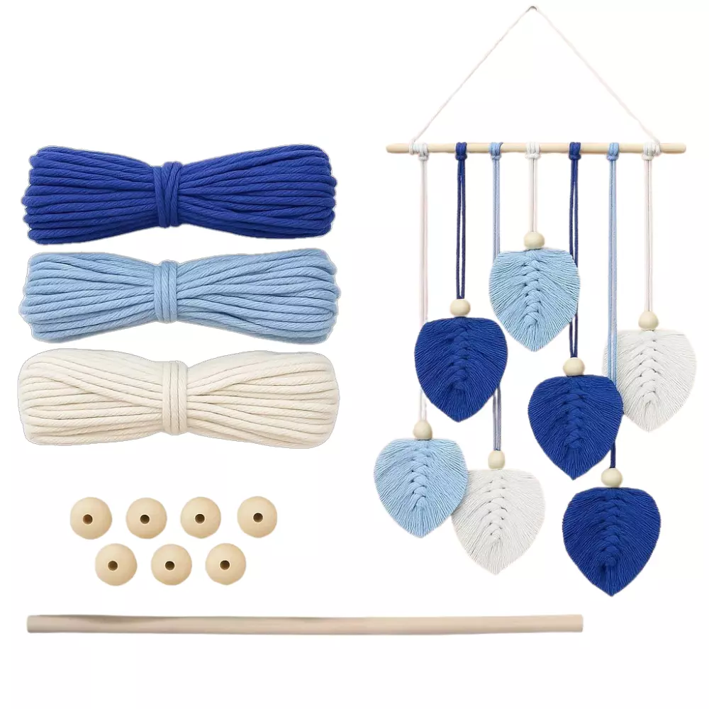 Набір макраме для ручного в'язання гобелена настінного декору «Листя» 37х30см, для рукоділля синьо-блакитний