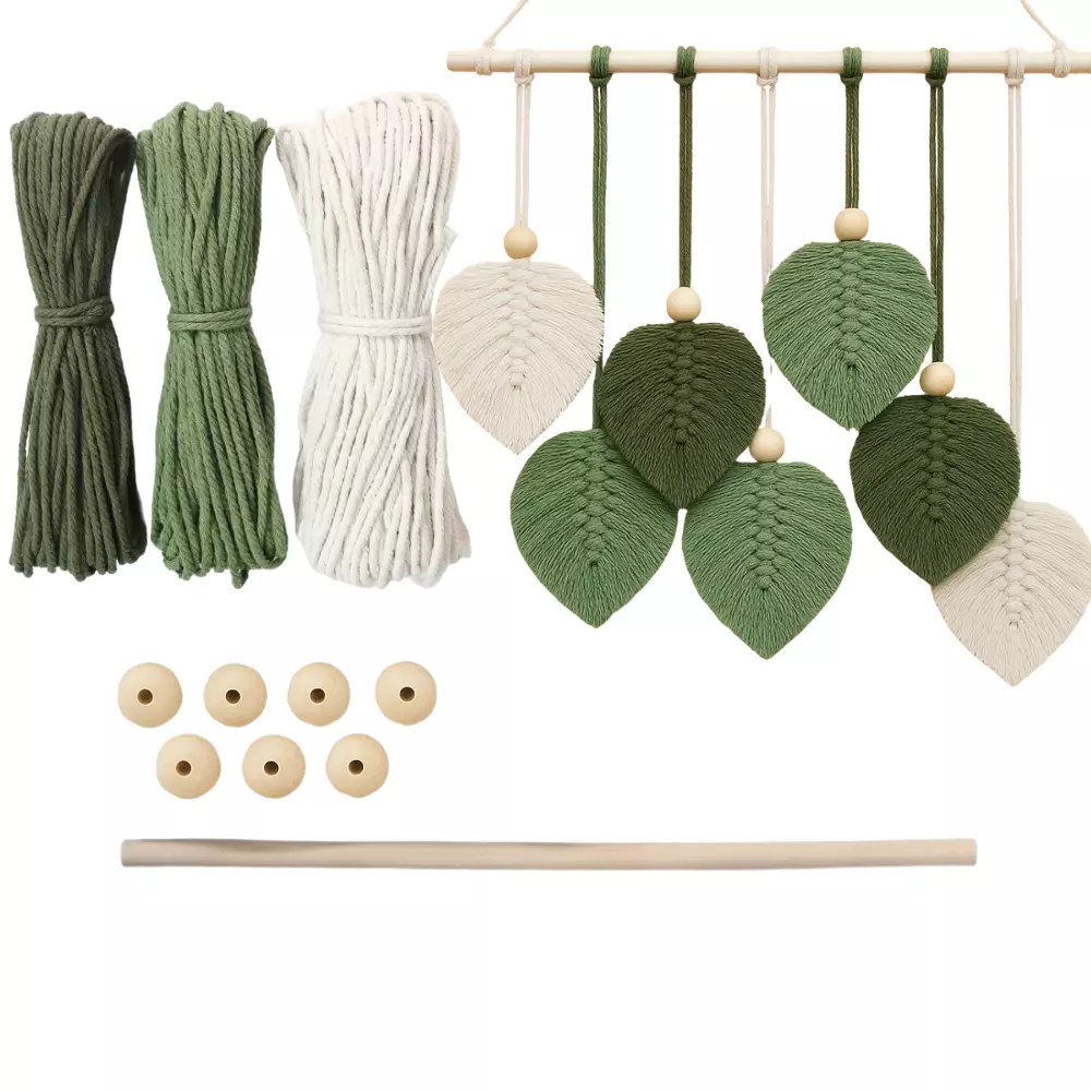 Набір макраме для ручного в'язання гобелена настінного декору «Листя» 37х30см, для рукоділля зелено-білий