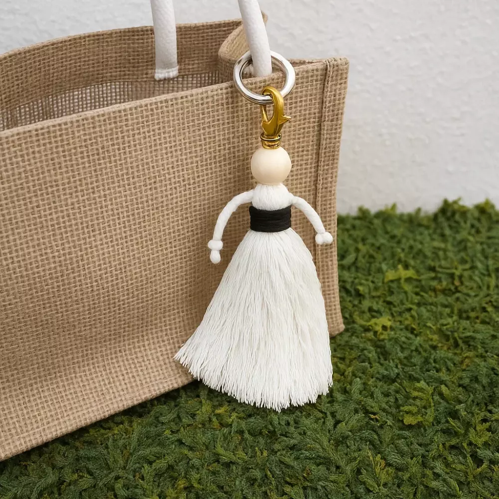 Набір макраме для рукоділля та плетіння брелока «Лялечка» для ключів і аксесуарів білий з чорним