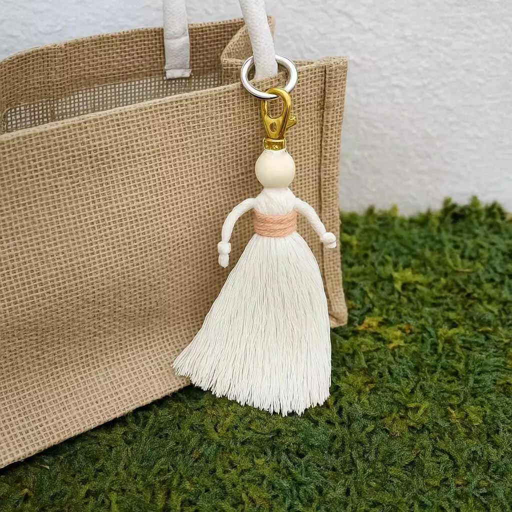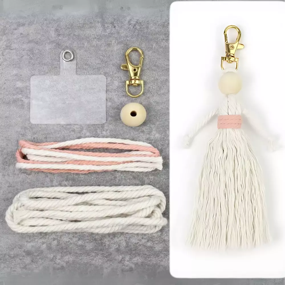 Набір макраме для рукоділля та плетіння брелока «Лялечка» для ключів і аксесуарів білий з персиковим