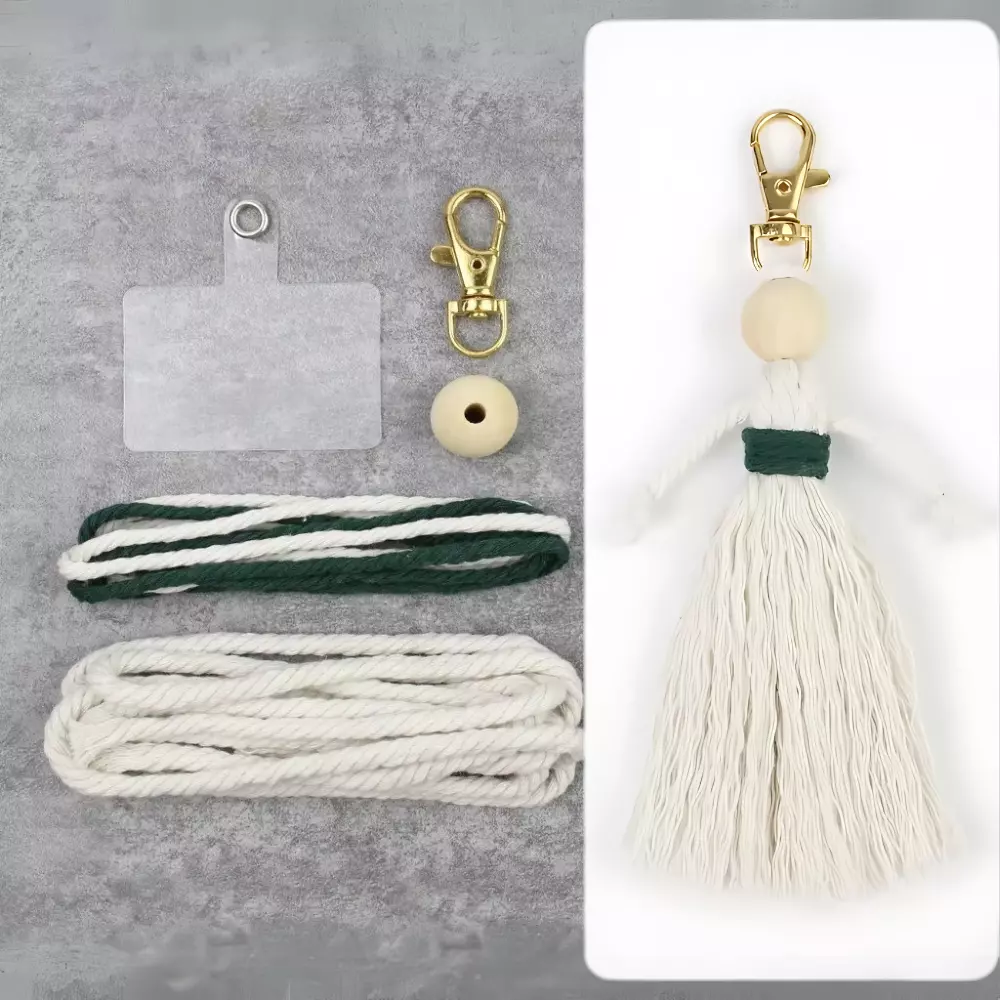 Набір макраме для рукоділля та плетіння брелока «Лялечка» для ключів і аксесуарів білий з темно-зеленим