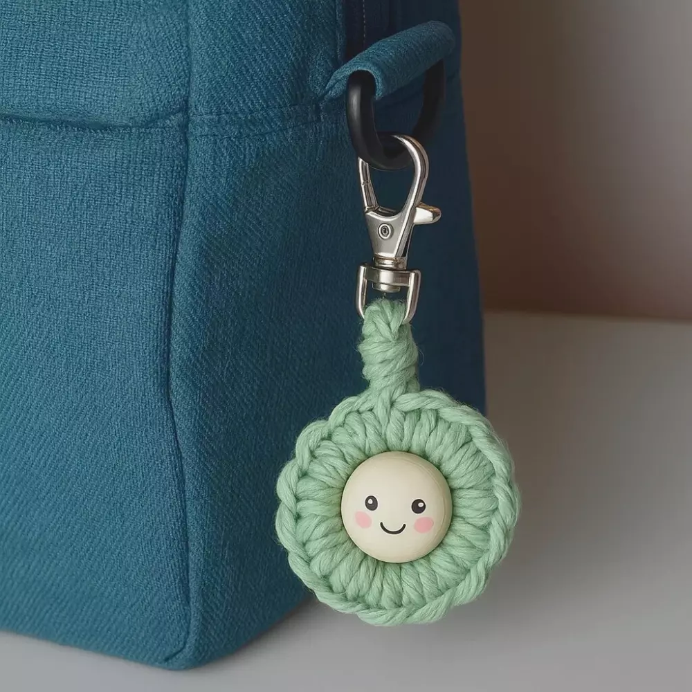 ключів або сумки. Готовий виріб має круглу форму з дерев’яною