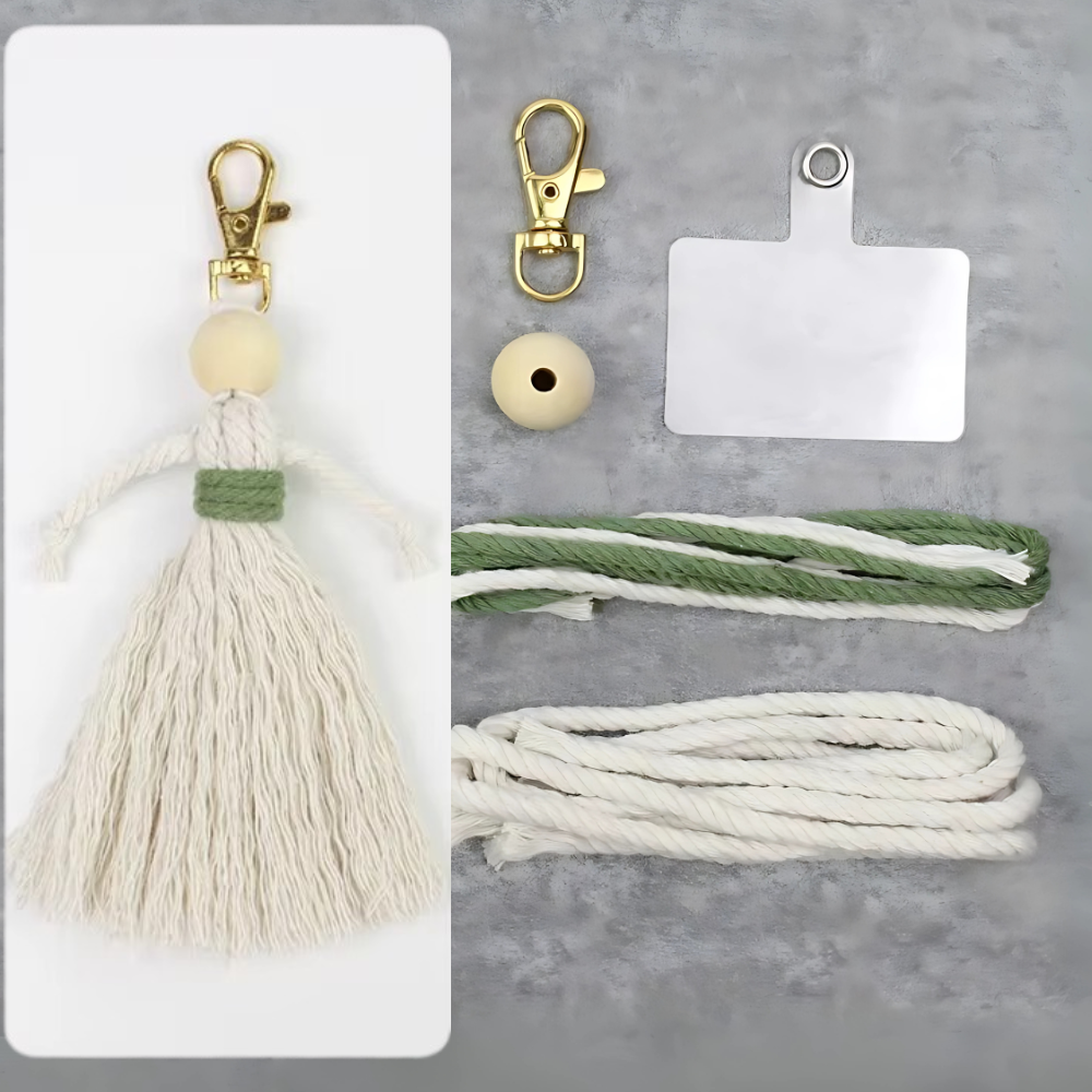 Набір макраме для в'язання та рукоділля брелока на сумку, для ключів та аксесуарів «Лялечка» білий з зеленим
