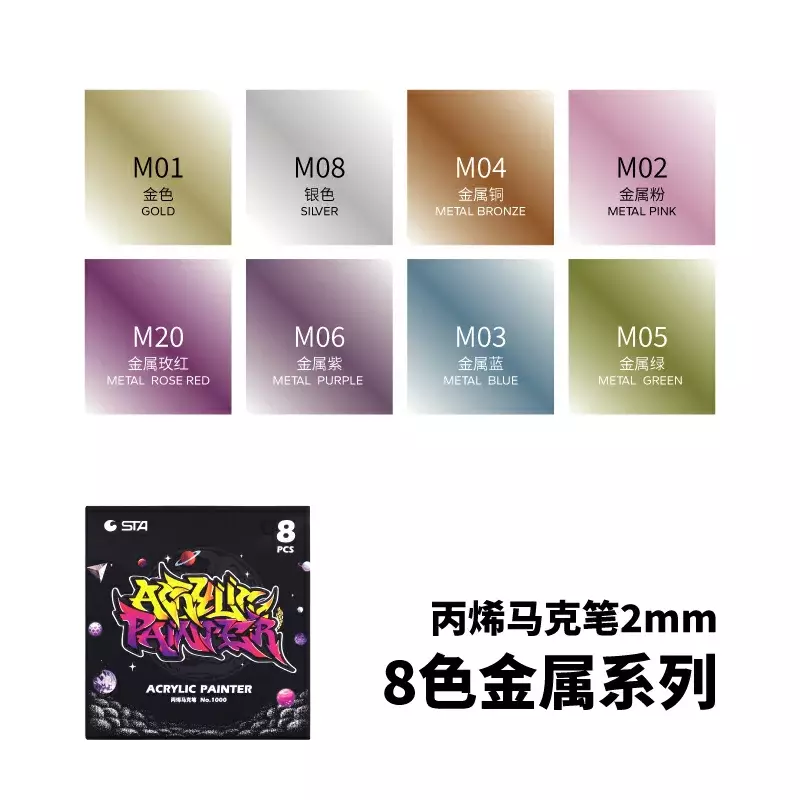 Маркери акрилові STA для малювання, преміум якість, набір 8 Metallic кольорів, універсальні для скла, дерева, ткани та кераміки