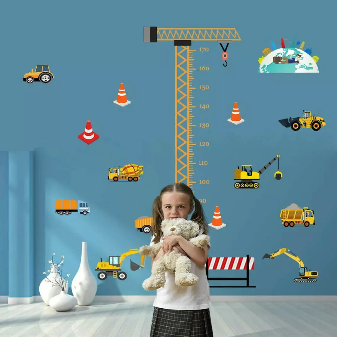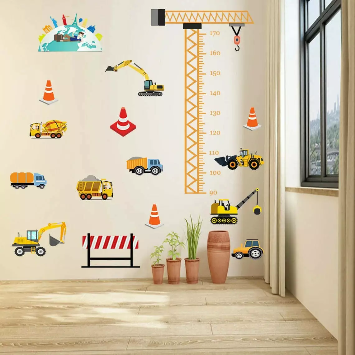 Особливістю набору є висотний кран з вимірювальною шкалою для визначення росту дитини. Шкала дозволяє відстежувати зріст від 90 до 170 см, що робить наклейку не тільки стильним декором, але й корисним інструментом для батьків. За допомогою цих наклейок ви зможете легко оформити простір в кімнаті вашого малюка, додавши яскраві та функціональні елементи.