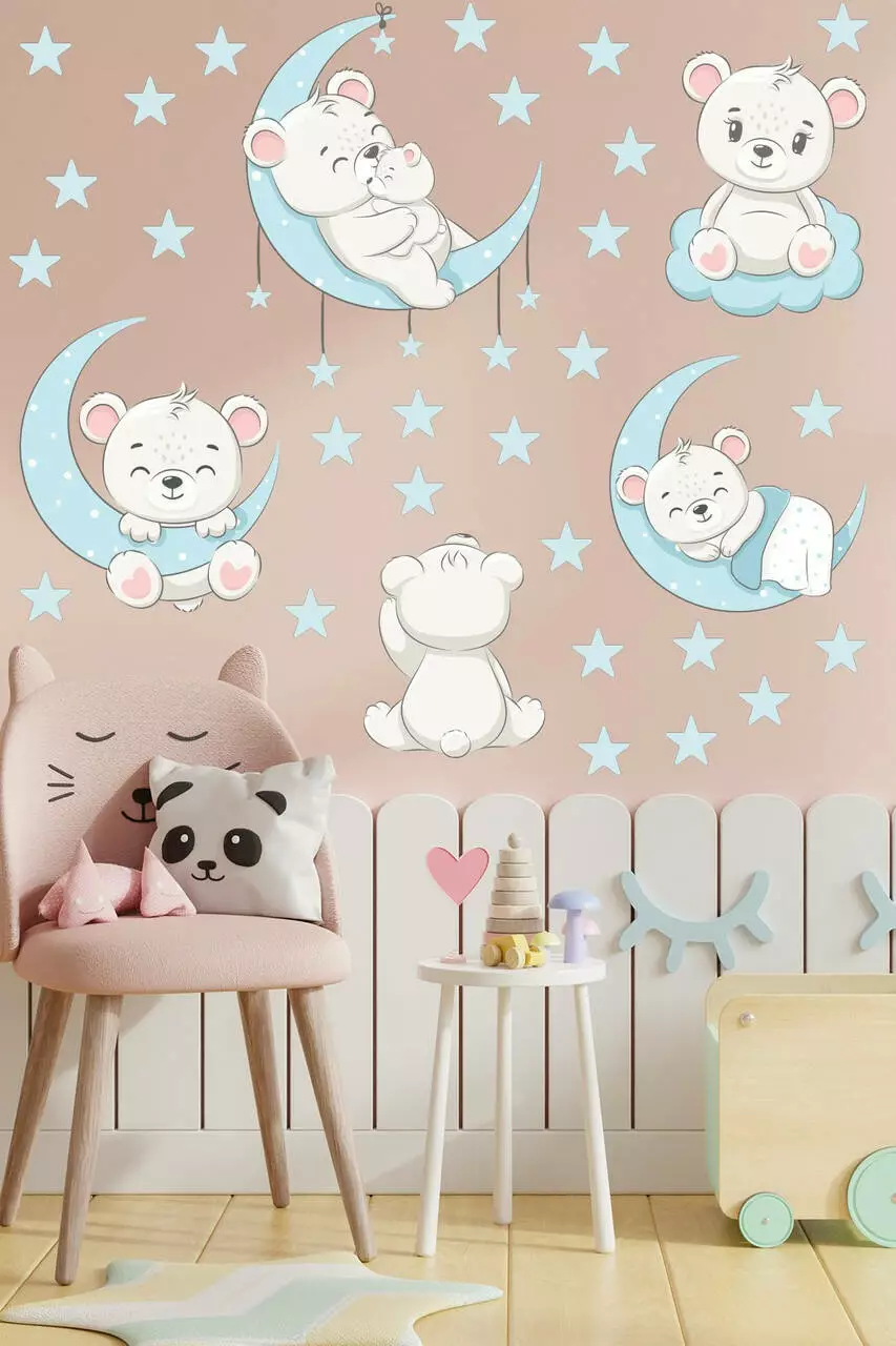 Цей набір стане чудовою прикрасою та допоможе створити затишну атмосферу для вашої дитини. Ведмежата, розташовані на місяцях і хмарі, привнесуть відчуття тепла і турботи, створюючи спокійний і комфортний простір. Підходить для будь-якого інтер'єру завдяки універсальному дизайну.