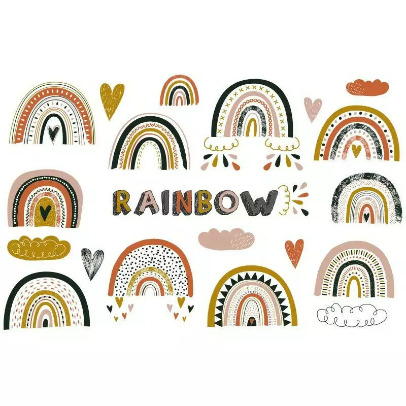 Наліпки мають загальний розмір 30х80 см, а в комплекті ви знайдете 12 елементів, які легко комбінуються між собою. Прикраса доповнена написом «Rainbow», що надає завершеного та стильного вигляду. Вони ідеально підходять для розміщення на стінах, меблях або будь-яких гладких поверхнях.