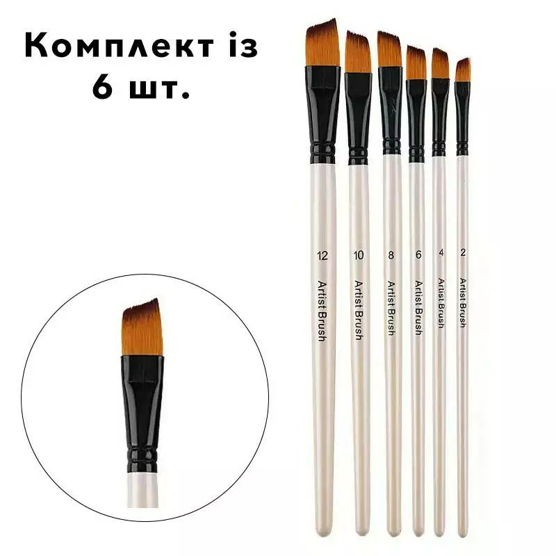 Набір пензлів для малювання 6 шт з нейлоновим ворсом та дерев'яною ручкою для акварелі, акрилу, олії, гуаші