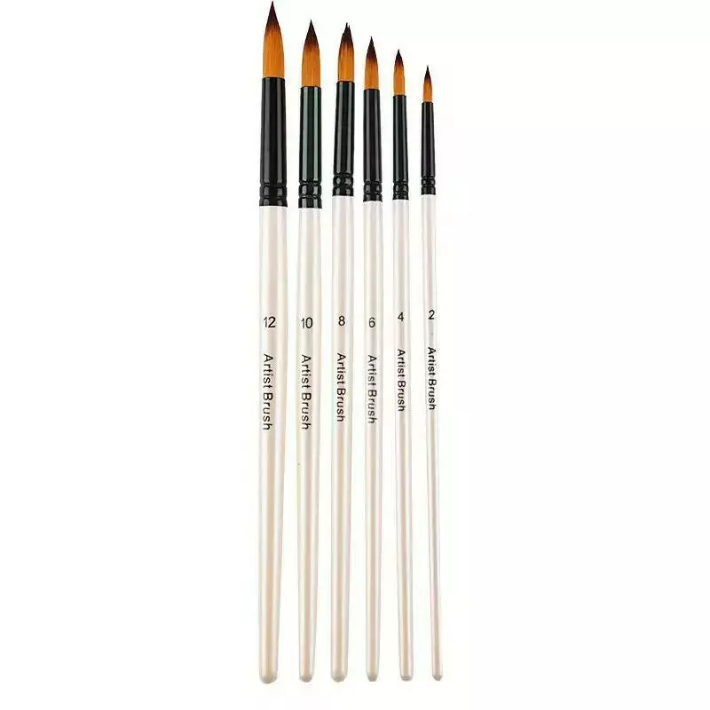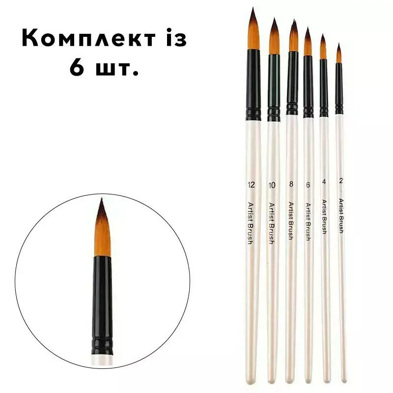 Набір пензлів для малювання 6 шт з нейлоновим ворсом та дерев'яною ручкою для акварелі, акрилу, олії, гуаші