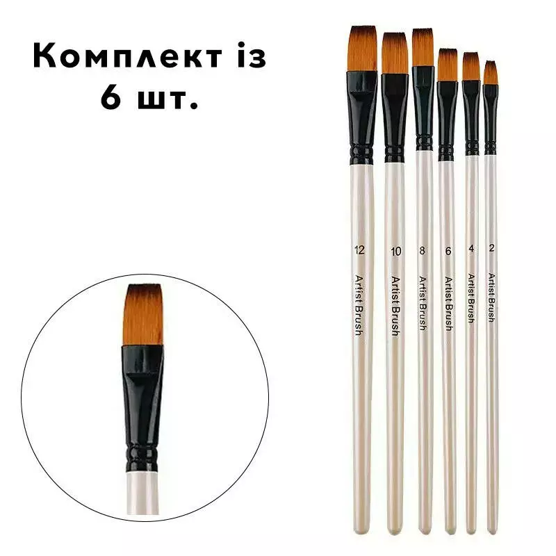 Набір пензлів для малювання 6 шт з нейлоновим ворсом та дерев'яною ручкою для акварелі, акрилу, олії, гуаші