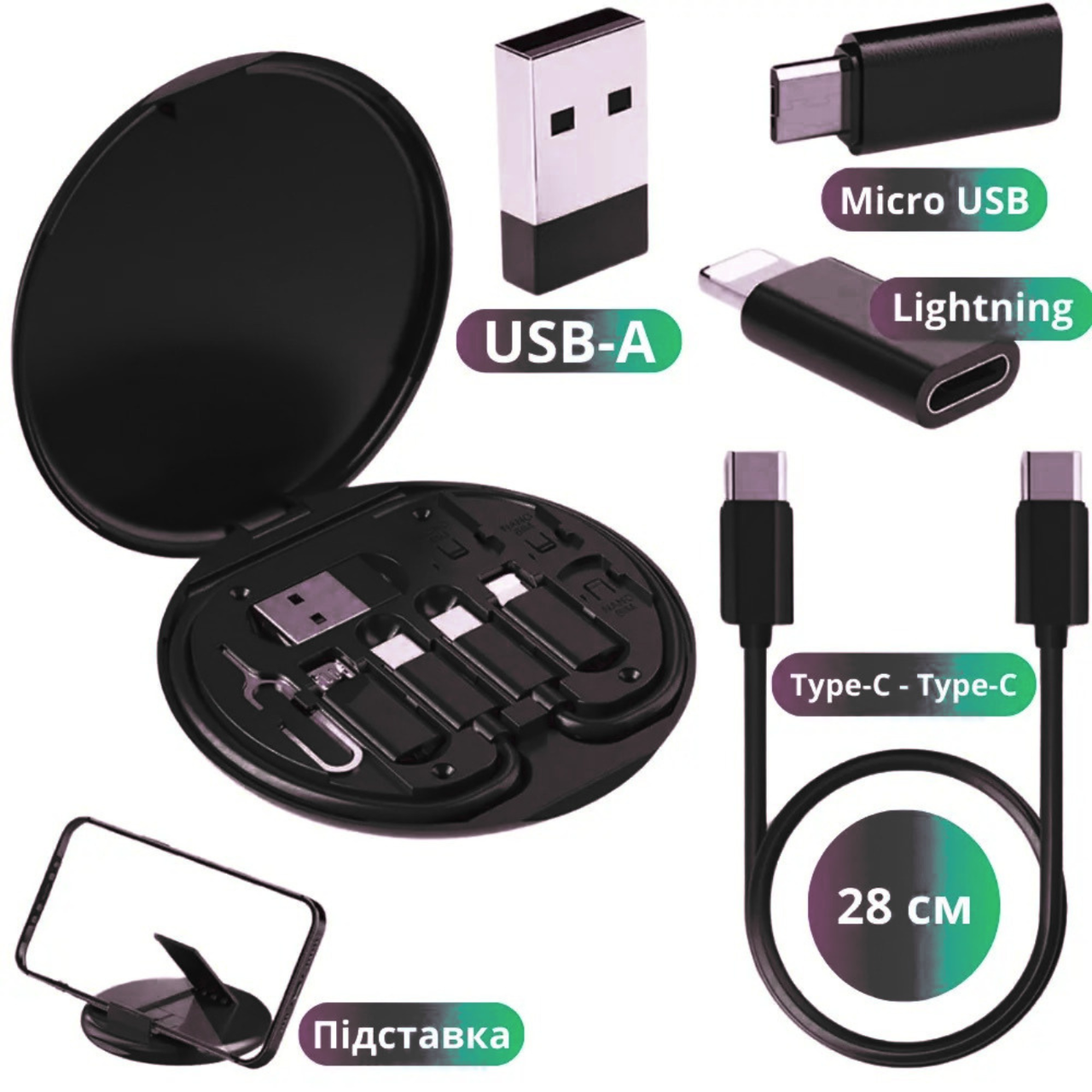 • Багатофункціональність 6 в 1 – зарядка, передача даних, зберігання SIM-карт і зручне користування смартфоном.