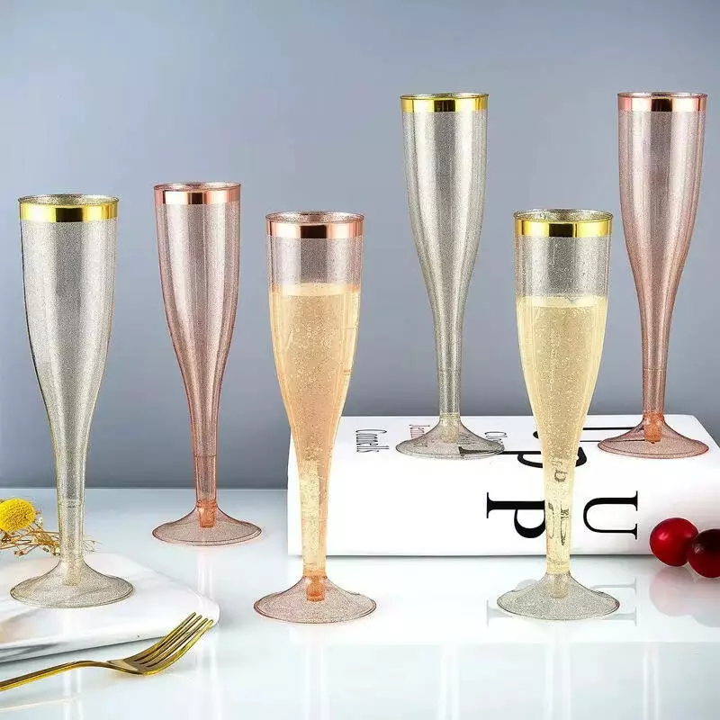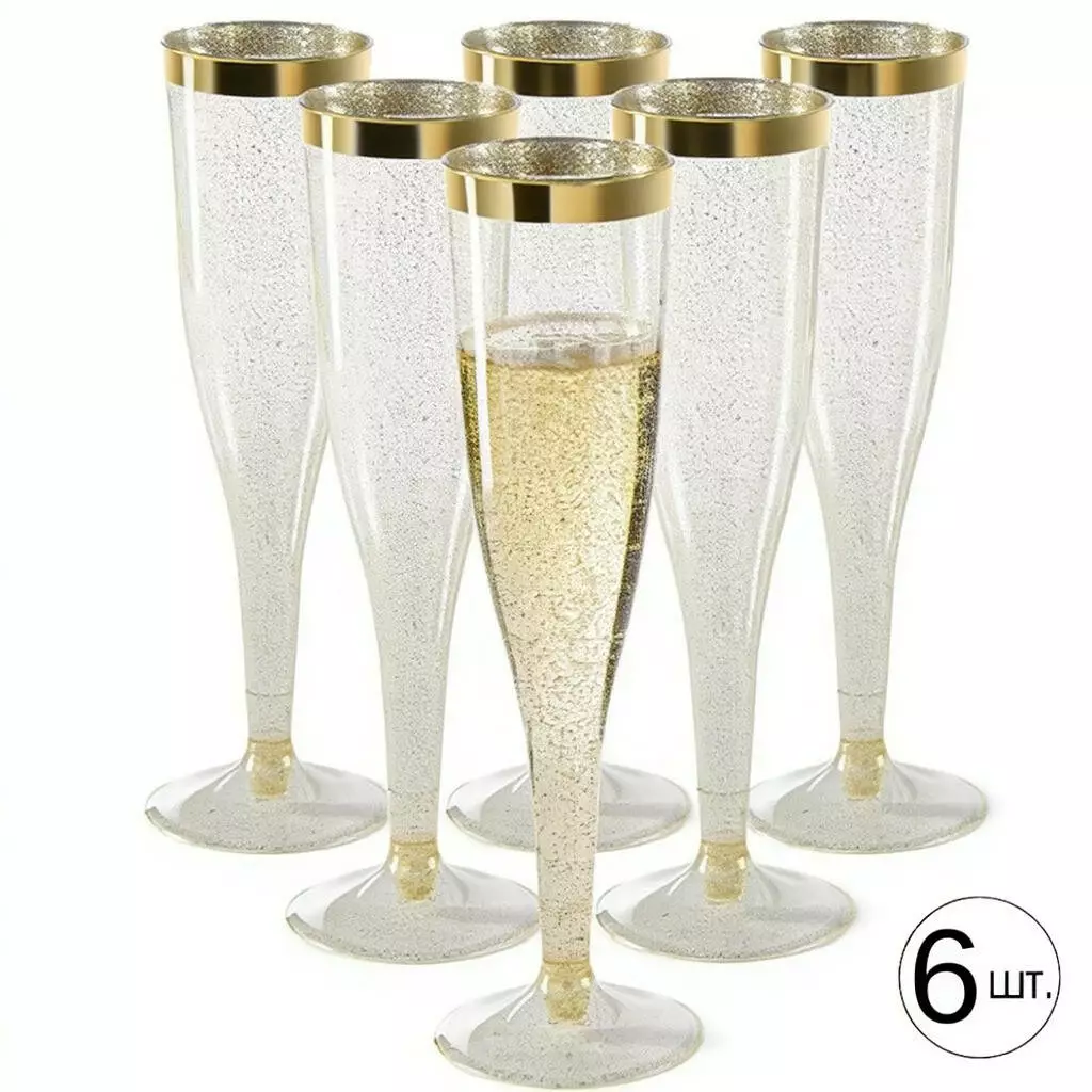 Набір пластикових келихів для шампанського 6 шт преміум класу 192 мл, для урочистостей і свят, золотисті з блискітками