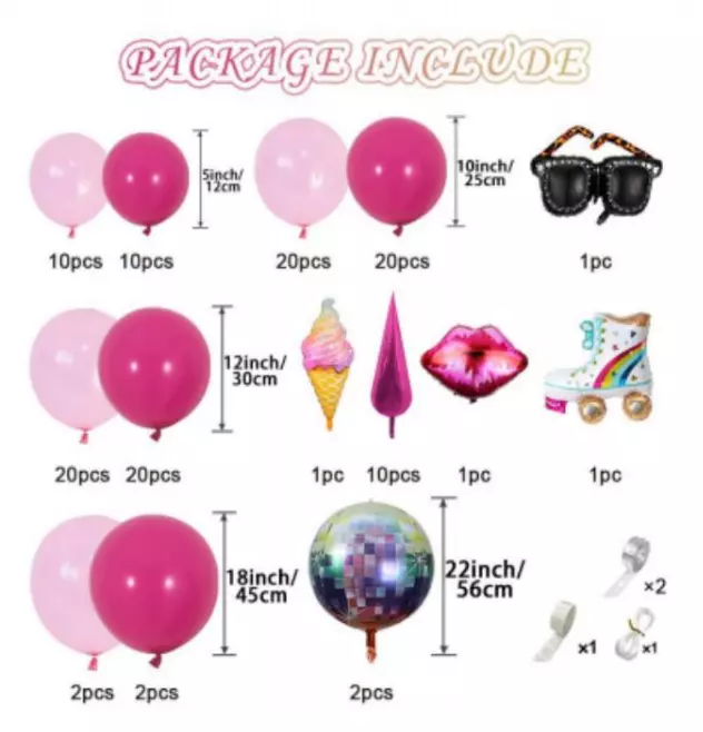 Кулі в наборі варіюються від маленьких у 5 дюймів до великих у 22 дюйми, що дає змогу створювати об'ємні композиції та прикрашати простір під будь-який сценарій. Яскраві фігурки морозива, губ і роликів додають веселощів і підкреслюють тематику свята. До набору також входять аксесуари, як-от окуляри та клейкі стрічки для зручності використання.