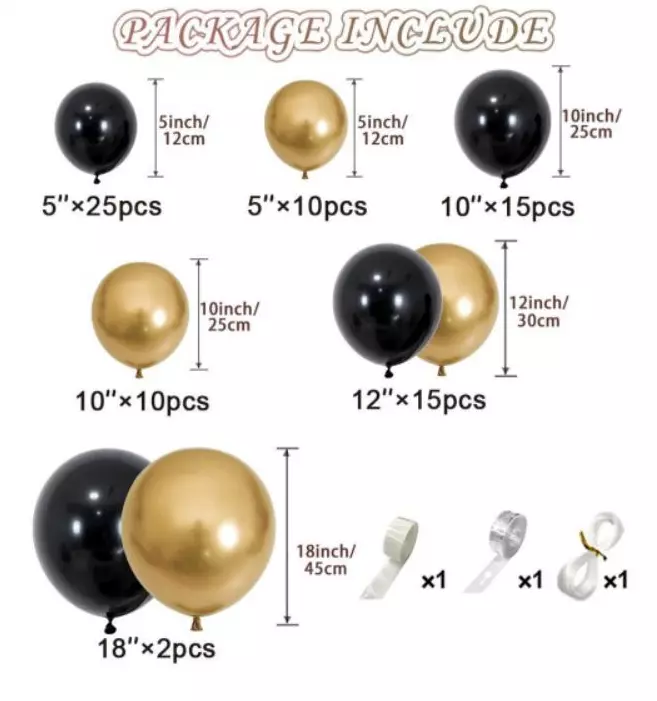У наборі представлені кулі різних діаметрів, починаючи з маленьких куль діаметром 5 дюймів, закінчуючи великими кулями на 18 дюймів. Це дає змогу використовувати їх для оформлення фотозон, арок або підвісних композицій. У комплект також входять аксесуари для закріплення куль, що робить процес декорації легким і швидким.