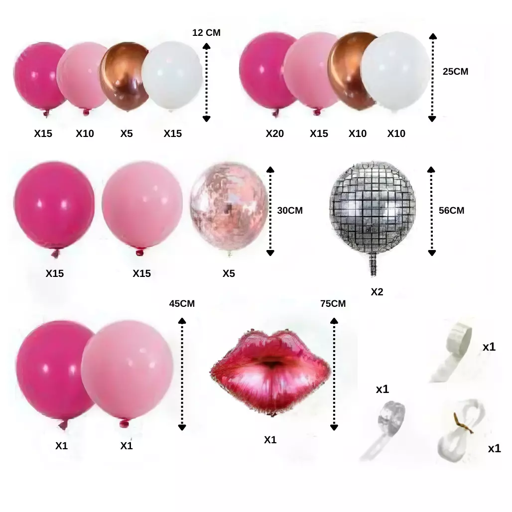 До набору входять кулі різних діаметрів - від 5 до 18 дюймів (12-45 см), що дає змогу створити об'ємні композиції та прикрасити приміщення на будь-який смак. Рожеві кулі поєднуються з кулями рожевого золота, а також блискучими прозорими кулями, що робить декор ще більш привабливим і цікавим. Ці кулі легко комбінуються, створюючи гармонійний дизайн, що запам'ятовується.