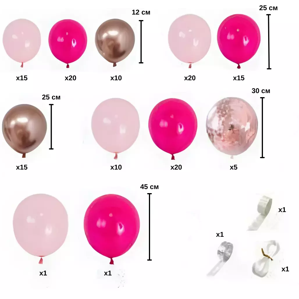 Кулі виготовлені з якісного латексу, який гарантує їхню міцність і довговічність. Вони легко надуваються як повітрям, так і гелієм, що дає можливість урізноманітнити варіанти оформлення. Комплект містить кулі різних розмірів, що дозволить вам створити об'ємні композиції для оформлення фотозони або декору залу.