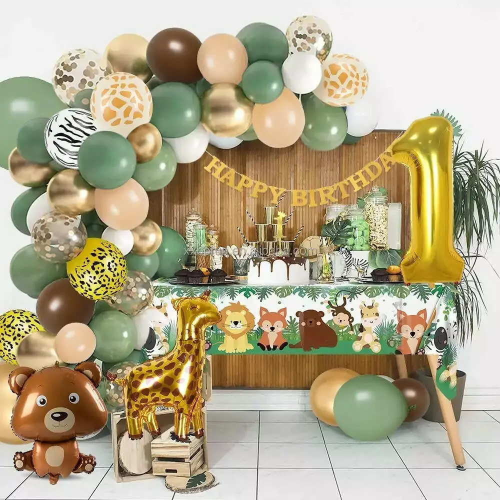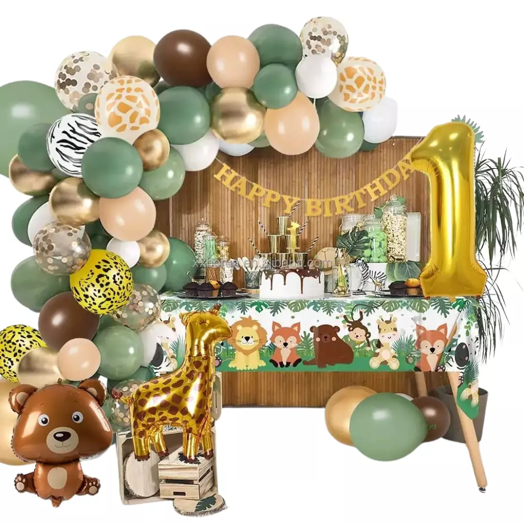 Комплект містить кулі із зображеннями тварин, таких як жираф і ведмежа, а також різні кульки у формі цифри «1», які підходять для першого дня народження. На додаток до стандартних куль, комплект також містить стрічки та аксесуари для легкого і швидкого прикрашання. Кожен елемент гармонійно доповнює один одного, що дає змогу легко створити тематичну прикрасу з тваринами.