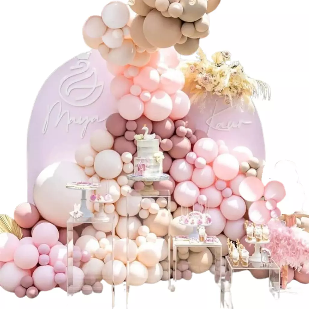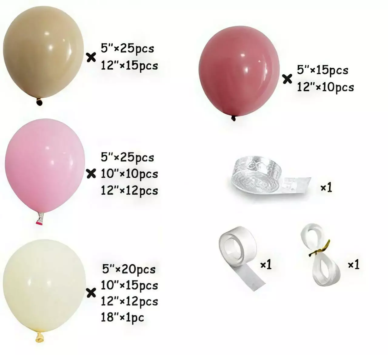 Набір включає кулі різних розмірів: 5, 10, 12 і 18 дюймів, що дає змогу створювати багатошарові композиції різної форми та висоти. Кольорова гама представлена пастельними та яскравими тонами, включно з кремовим, рожевим і бордовим. Ці кольори чудово поєднуються між собою, додаючи легкість та елегантність в оформлення вашого свята.