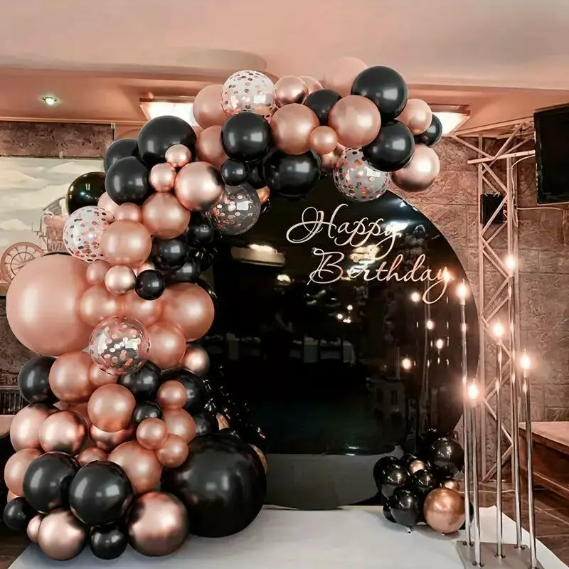 Цей комплект повітряних куль є ідеальним варіантом для оформлення урочистих заходів, таких як дні народження, весілля, вечірки або фотосесії. Кулі виконані у вишуканому поєднанні кольорів: рожеве золото, чорний і бронза. Набір включає кулі різних розмірів і відтінків, що дає змогу створити об'ємні та ефектні композиції для прикрашання простору.