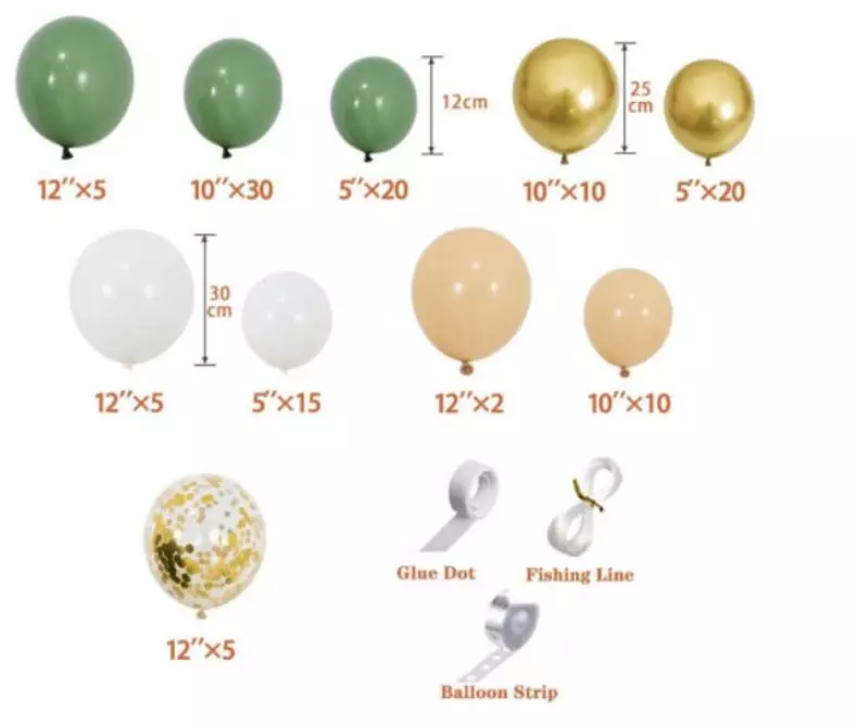 Набір включає кулі різних розмірів для досягнення багатошаровості та об'єму в декорі. У комплекті: 5 зелених куль розміром 12", 30 зелених куль 10", 20 зелених куль 5", 5 білих куль 12", 15 білих куль 5", 2 бежеві кулі 12", 10 бежевих куль 10", 5 золотих куль 12", 10 золотих куль 10", 20 золотих куль 5", а також 5 прозорих куль з блискітками розміром 12". Це дозволяє створювати як великі арки, так і більш компактні прикраси.