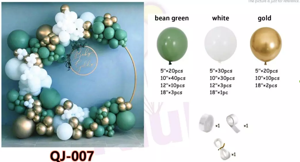 У наборі представлені кульки різних розмірів, що дозволяє створювати багатошарові й об'ємні композиції. Зелені кульки доступні в розмірах від 5 до 18 дюймів: 20 шт. 5", 40 шт. 10", 10 шт. 12", 3 шт. 18". Білі кульки представлені в аналогічних розмірах: 30 шт. 5", 30 шт. 10", 3 шт. 12", 1 шт. 18". Золоті кульки додають розкіш і блиск, пропонуючи 20 шт. 5", 10 шт. 10", 2 шт. 18". Комбінація цих кульок створює ефектну атмосферу для будь-якого свята.